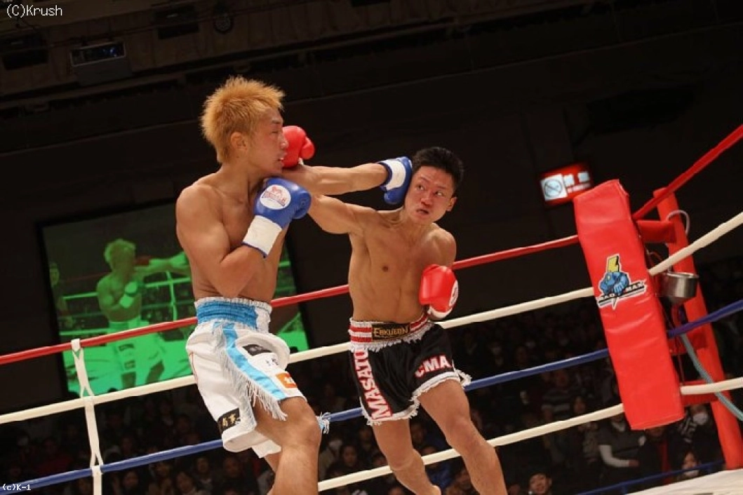 2R、結城はインローを蹴って、パンチのコンビネーションから右ロー。Kazyosiも右ストレートから連打をまとめる。結城も退かずに打ち合い、右ストレートから左フック、右フックを叩き込む。パンチを返すKazyosiだったが、結城が右ストレートから連打をまとめて、Kazyosiの蹴りに右のパンチを合せてダウンを奪う。